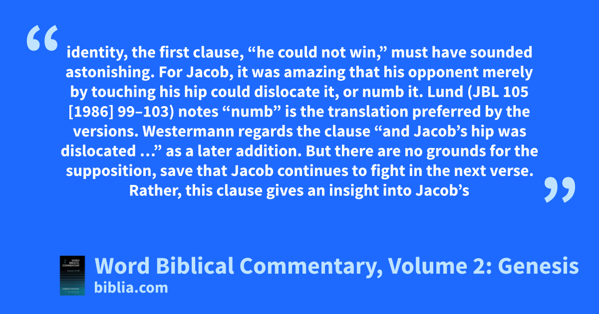 identity, the first clause, “he could not win,” must have sounded astonishing. For Jacob, it was amazing that his opponent merely by touching his hip could dislocate it, or numb it. Lund (JBL 105 [1986] 99–103) notes “numb” is the translation preferred by the versions. Westermann regards the clause “and Jacob’s hip was dislocated …” as a later addition. But there are no grounds for the supposition, save that Jacob continues to fight in the next verse. Rather, this clause gives an insight into Jacob’s
