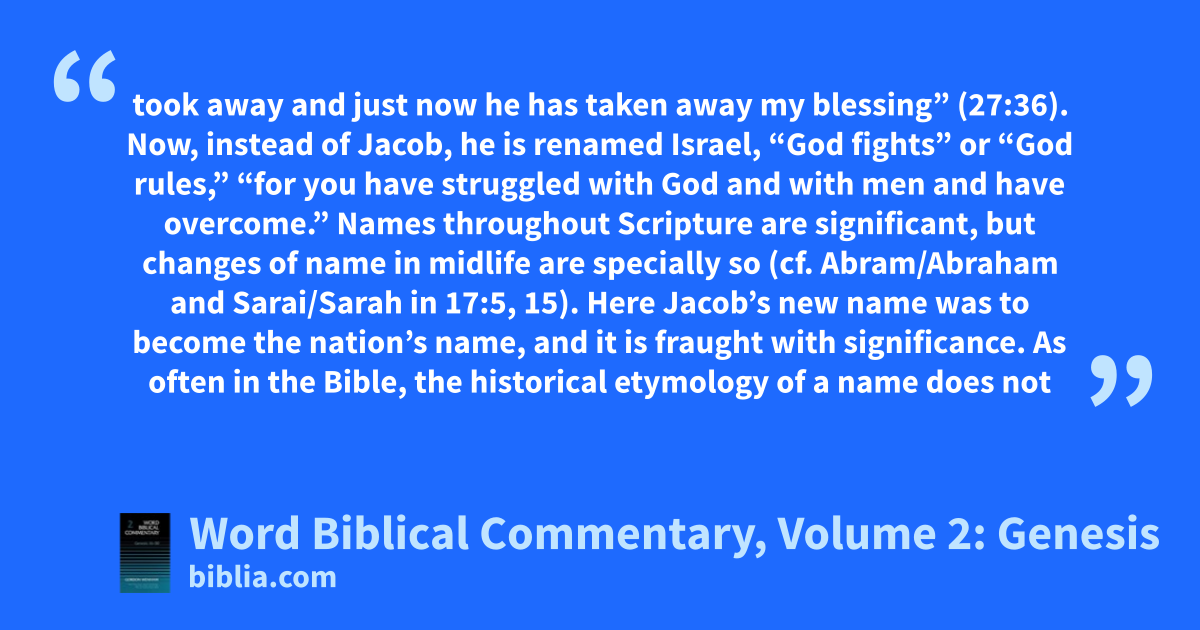 took away and just now he has taken away my blessing” (27:36). Now, instead of Jacob, he is renamed Israel, “God fights” or “God rules,” “for you have struggled with God and with men and have overcome.” Names throughout Scripture are significant, but changes of name in midlife are specially so (cf. Abram/Abraham and Sarai/Sarah in 17:5, 15). Here Jacob’s new name was to become the nation’s name, and it is fraught with significance. As often in the Bible, the historical etymology of a name does not