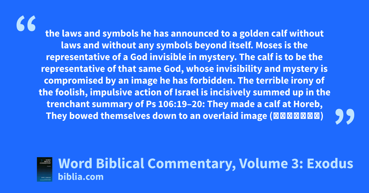 the laws and symbols he has announced to a golden calf without laws and without any symbols beyond itself. Moses is the representative of a God invisible in mystery. The calf is to be the representative of that same God, whose invisibility and mystery is compromised by an image he has forbidden. The terrible irony of the foolish, impulsive action of Israel is incisively summed up in the trenchant summary of Ps 106:19–20: They made a calf at Horeb, They bowed themselves down to an overlaid image (מַסֵכָה)