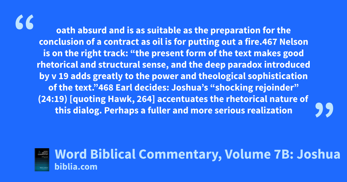oath absurd and is as suitable as the preparation for the conclusion of a contract as oil is for putting out a fire.467 Nelson is on the right track: “the present form of the text makes good rhetorical and structural sense, and the deep paradox introduced by v 19 adds greatly to the power and theological sophistication of the text.”468 Earl decides: Joshua’s “shocking rejoinder” (24:19) [quoting Hawk, 264] accentuates the rhetorical nature of this dialog. Perhaps a fuller and more serious realization