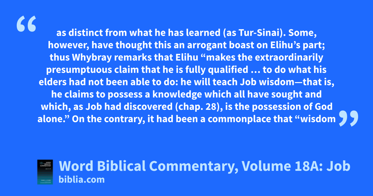 as distinct from what he has learned (as Tur-Sinai). Some, however, have thought this an arrogant boast on Elihu’s part; thus Whybray remarks that Elihu “makes the extraordinarily presumptuous claim that he is fully qualified … to do what his elders had not been able to do: he will teach Job wisdom—that is, he claims to possess a knowledge which all have sought and which, as Job had discovered (chap. 28), is the possession of God alone.” On the contrary, it had been a commonplace that “wisdom