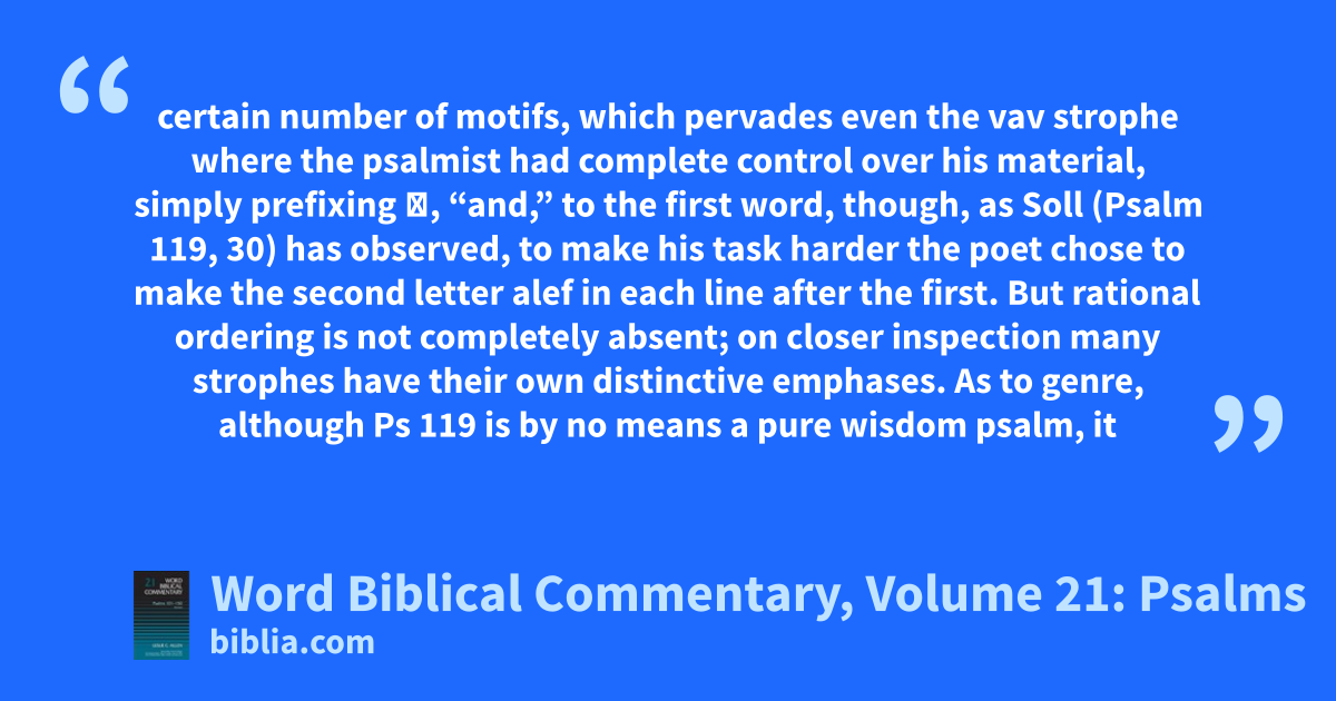certain number of motifs, which pervades even the vav strophe where the psalmist had complete control over his material, simply prefixing ו, “and,” to the first word, though, as Soll (Psalm 119, 30) has observed, to make his task harder the poet chose to make the second letter alef in each line after the first. But rational ordering is not completely absent; on closer inspection many strophes have their own distinctive emphases. As to genre, although Ps 119 is by no means a pure wisdom psalm, it