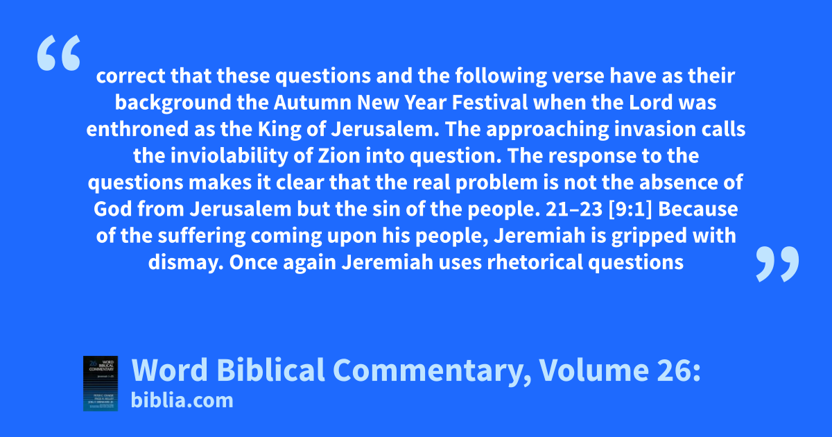 correct that these questions and the following verse have as their background the Autumn New Year Festival when the Lord was enthroned as the King of Jerusalem. The approaching invasion calls the inviolability of Zion into question. The response to the questions makes it clear that the real problem is not the absence of God from Jerusalem but the sin of the people. 21–23 [9:1] Because of the suffering coming upon his people, Jeremiah is gripped with dismay. Once again Jeremiah uses rhetorical questions