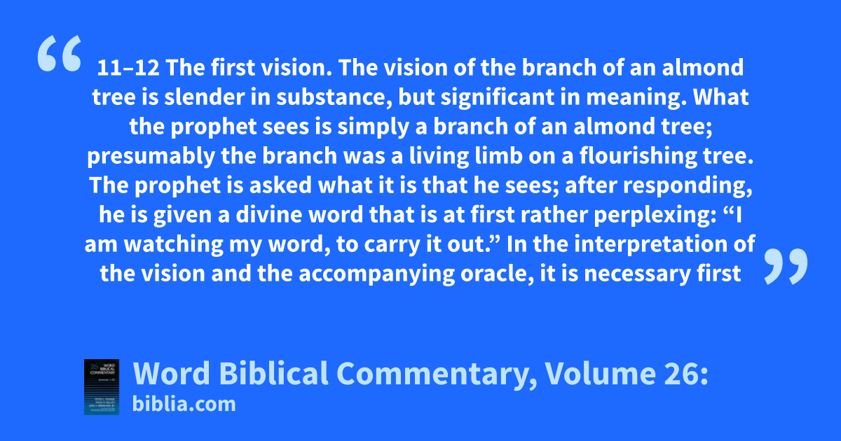 11–12 The first vision. The vision of the branch of an almond tree is slender in substance, but significant in meaning. What the prophet sees is simply a branch of an almond tree; presumably the branch was a living limb on a flourishing tree. The prophet is asked what it is that he sees; after responding, he is given a divine word that is at first rather perplexing: “I am watching my word, to carry it out.” In the interpretation of the vision and the accompanying oracle, it is necessary first