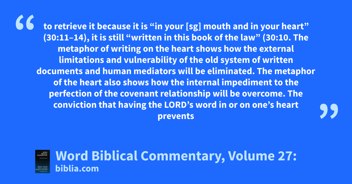 to retrieve it because it is “in your [sg] mouth and in your heart” (30:11–14), it is still “written in this book of the law” (30:10. The metaphor of writing on the heart shows how the external limitations and vulnerability of the old system of written documents and human mediators will be eliminated. The metaphor of the heart also shows how the internal impediment to the perfection of the covenant relationship will be overcome. The conviction that having the LORD’s word in or on one’s heart prevents