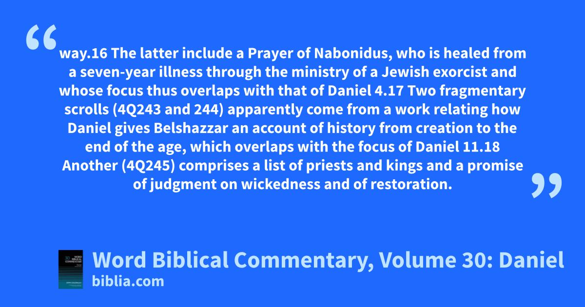 way.16 The latter include a Prayer of Nabonidus, who is healed from a seven-year illness through the ministry of a Jewish exorcist and whose focus thus overlaps with that of Daniel 4.17 Two fragmentary scrolls (4Q243 and 244) apparently come from a work relating how Daniel gives Belshazzar an account of history from creation to the end of the age, which overlaps with the focus of Daniel 11.18 Another (4Q245) comprises a list of priests and kings and a promise of judgment on wickedness and of restoration.