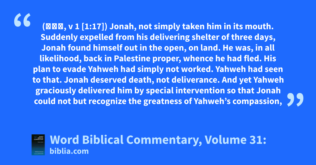 (בלע, v 1 [1:17]) Jonah, not simply taken him in its mouth. Suddenly expelled from his delivering shelter of three days, Jonah found himself out in the open, on land. He was, in all likelihood, back in Palestine proper, whence he had fled. His plan to evade Yahweh had simply not worked. Yahweh had seen to that. Jonah deserved death, not deliverance. And yet Yahweh graciously delivered him by special intervention so that Jonah could not but recognize the greatness of Yahweh’s compassion,