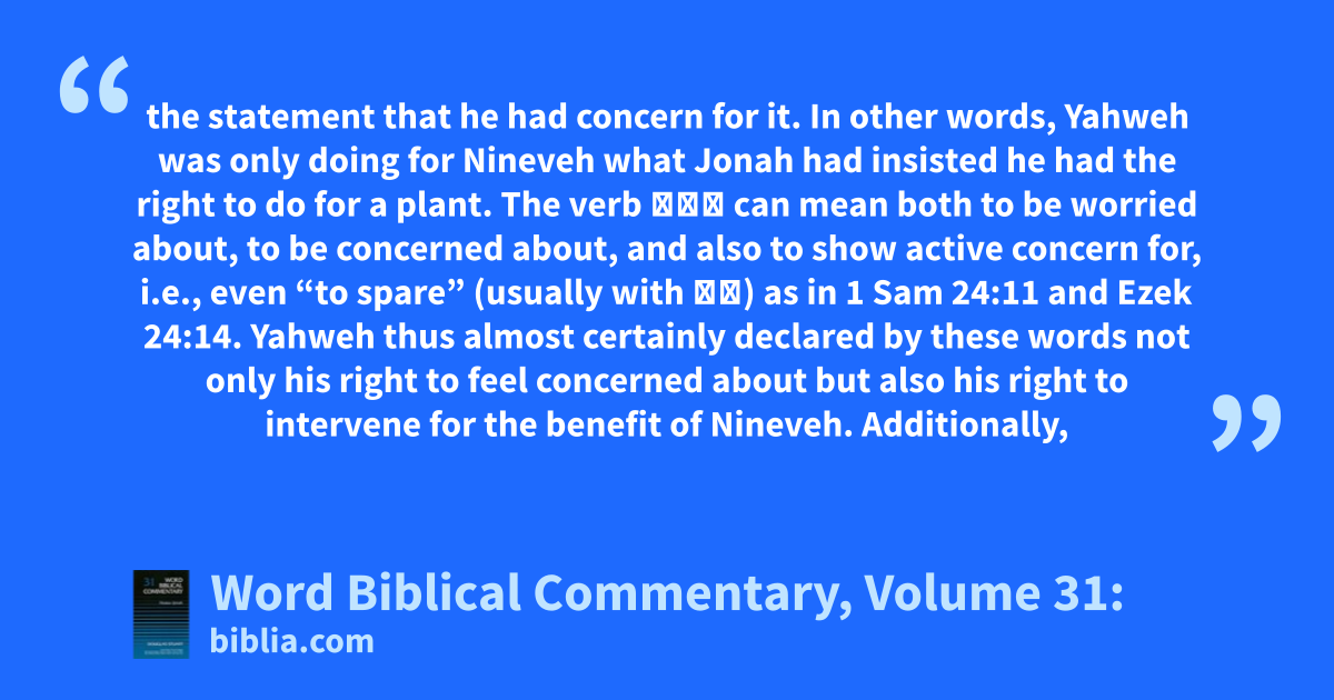 the statement that he had concern for it. In other words, Yahweh was only doing for Nineveh what Jonah had insisted he had the right to do for a plant. The verb חוס can mean both to be worried about, to be concerned about, and also to show active concern for, i.e., even “to spare” (usually with על) as in 1 Sam 24:11 and Ezek 24:14. Yahweh thus almost certainly declared by these words not only his right to feel concerned about but also his right to intervene for the benefit of Nineveh. Additionally,