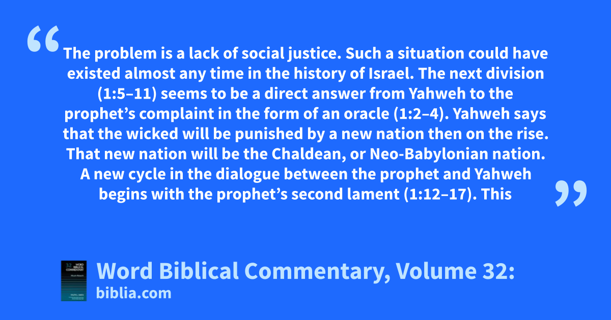 The problem is a lack of social justice. Such a situation could have existed almost any time in the history of Israel. The next division (1:5–11) seems to be a direct answer from Yahweh to the prophet’s complaint in the form of an oracle (1:2–4). Yahweh says that the wicked will be punished by a new nation then on the rise. That new nation will be the Chaldean, or Neo-Babylonian nation. A new cycle in the dialogue between the prophet and Yahweh begins with the prophet’s second lament (1:12–17). This