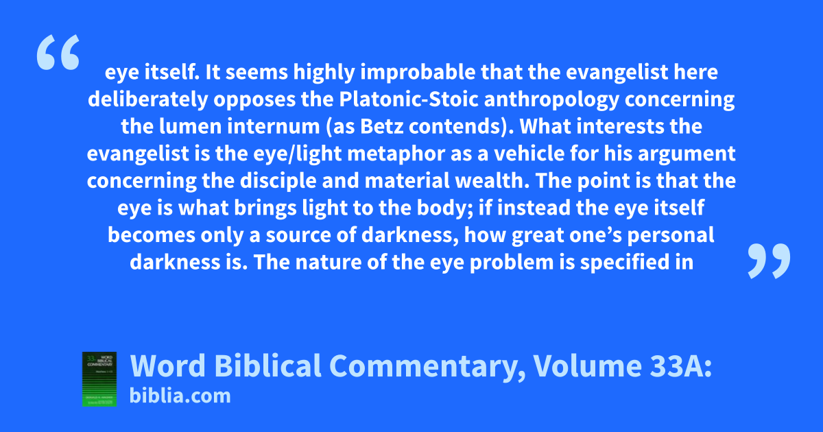 eye itself. It seems highly improbable that the evangelist here deliberately opposes the Platonic-Stoic anthropology concerning the lumen internum (as Betz contends). What interests the evangelist is the eye/light metaphor as a vehicle for his argument concerning the disciple and material wealth. The point is that the eye is what brings light to the body; if instead the eye itself becomes only a source of darkness, how great one’s personal darkness is. The nature of the eye problem is specified in