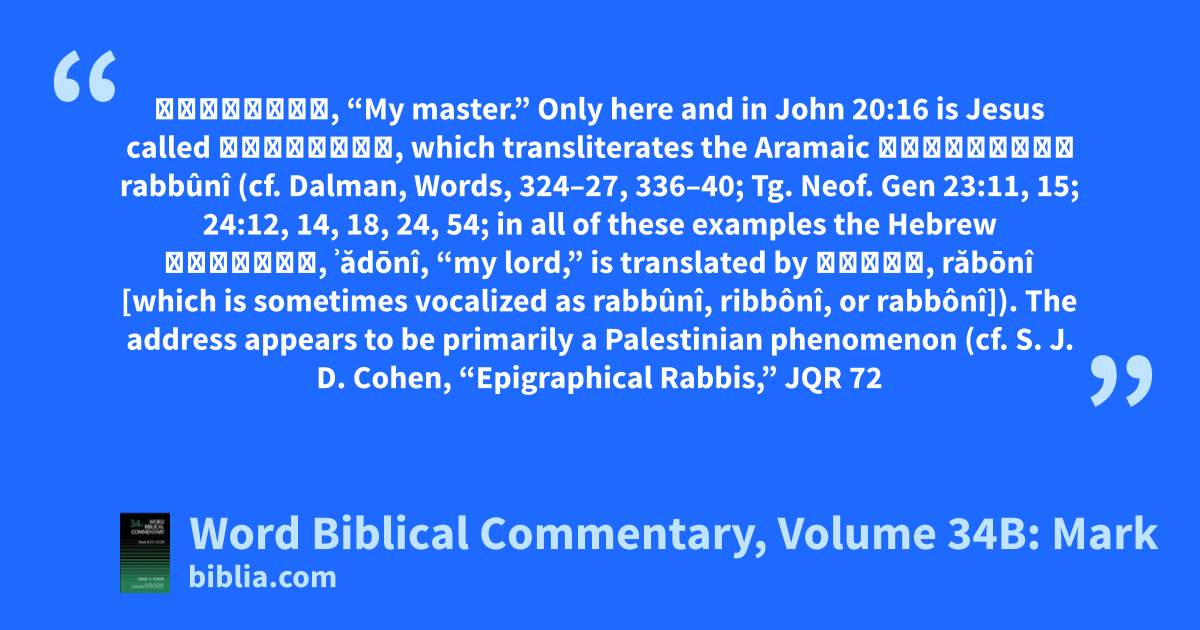 ῥαββουνί, “My master.” Only here and in John 20:16 is Jesus called ῥαββουνί, which transliterates the Aramaic רַבּוּנִי rabbûnî (cf. Dalman, Words, 324–27, 336–40; Tg. Neof. Gen 23:11, 15; 24:12, 14, 18, 24, 54; in all of these examples the Hebrew אֲדֹנִי, ʾădōnî, “my lord,” is translated by רבוני, răbōnî [which is sometimes vocalized as rabbûnî, ribbônî, or rabbônî]). The address appears to be primarily a Palestinian phenomenon (cf. S. J. D. Cohen, “Epigraphical Rabbis,” JQR 72