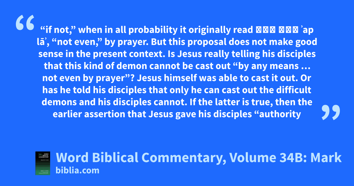 “if not,” when in all probability it originally read פאף לָא ʾap lāʾ, “not even,” by prayer. But this proposal does not make good sense in the present context. Is Jesus really telling his disciples that this kind of demon cannot be cast out “by any means … not even by prayer”? Jesus himself was able to cast it out. Or has he told his disciples that only he can cast out the difficult demons and his disciples cannot. If the latter is true, then the earlier assertion that Jesus gave his disciples “authority