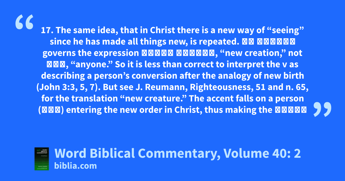 17. The same idea, that in Christ there is a new way of “seeing” since he has made all things new, is repeated. ἐν Χριστῷ governs the expression καινὴ κτίσις, “new creation,” not τις, “anyone.” So it is less than correct to interpret the v as describing a person’s conversion after the analogy of new birth (John 3:3, 5, 7). But see J. Reumann, Righteousness, 51 and n. 65, for the translation “new creature.” The accent falls on a person (τις) entering the new order in Christ, thus making the καινῆ