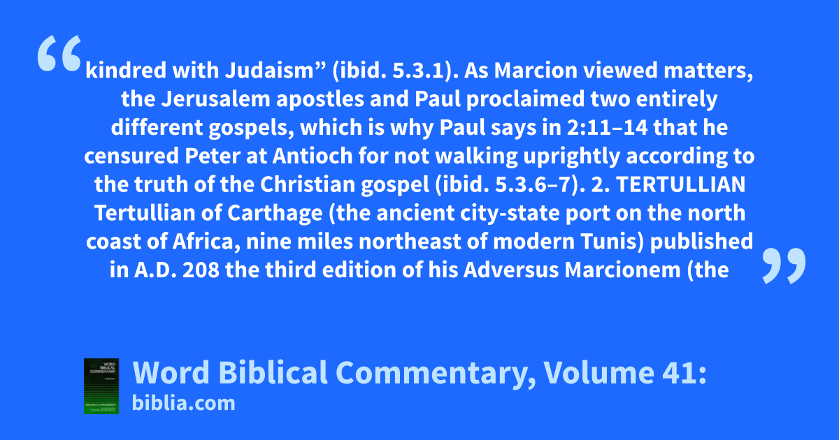 kindred with Judaism” (ibid. 5.3.1). As Marcion viewed matters, the Jerusalem apostles and Paul proclaimed two entirely different gospels, which is why Paul says in 2:11–14 that he censured Peter at Antioch for not walking uprightly according to the truth of the Christian gospel (ibid. 5.3.6–7). 2. TERTULLIAN Tertullian of Carthage (the ancient city-state port on the north coast of Africa, nine miles northeast of modern Tunis) published in A.D. 208 the third edition of his Adversus Marcionem (the