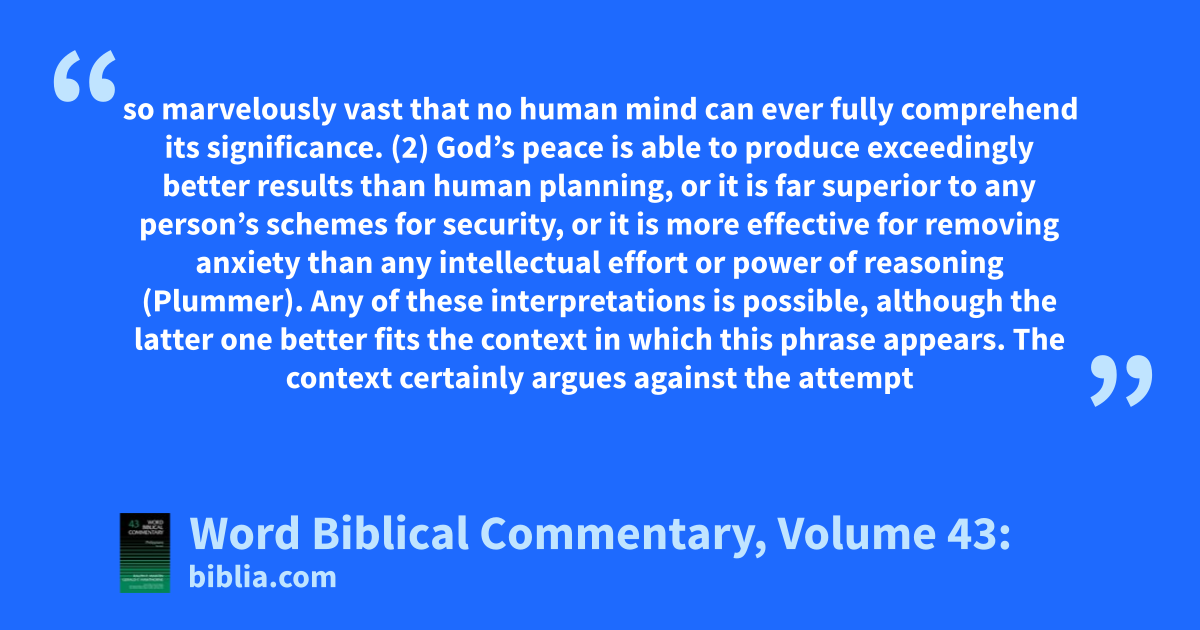 so marvelously vast that no human mind can ever fully comprehend its significance. (2) God’s peace is able to produce exceedingly better results than human planning, or it is far superior to any person’s schemes for security, or it is more effective for removing anxiety than any intellectual effort or power of reasoning (Plummer). Any of these interpretations is possible, although the latter one better fits the context in which this phrase appears. The context certainly argues against the attempt