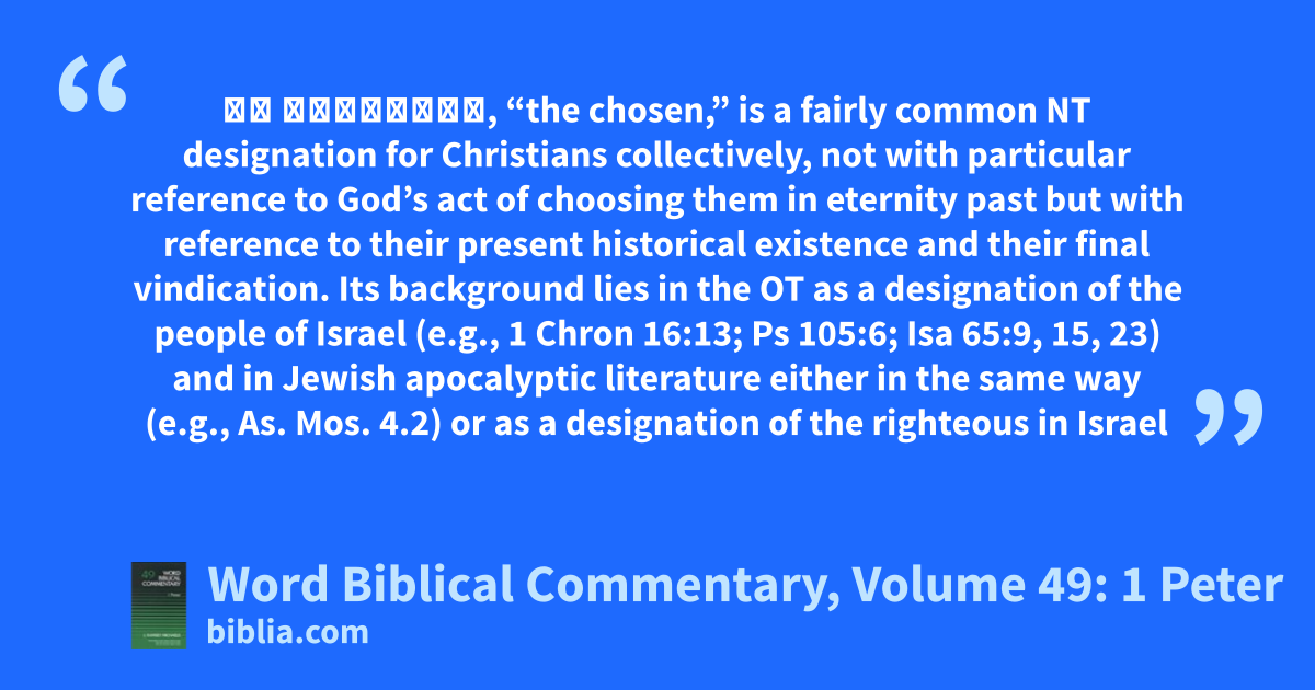 οἱ ἐκλεκτοί, “the chosen,” is a fairly common NT designation for Christians collectively, not with particular reference to God’s act of choosing them in eternity past but with reference to their present historical existence and their final vindication. Its background lies in the OT as a designation of the people of Israel (e.g., 1 Chron 16:13; Ps 105:6; Isa 65:9, 15, 23) and in Jewish apocalyptic literature either in the same way (e.g., As. Mos. 4.2) or as a designation of the righteous in Israel