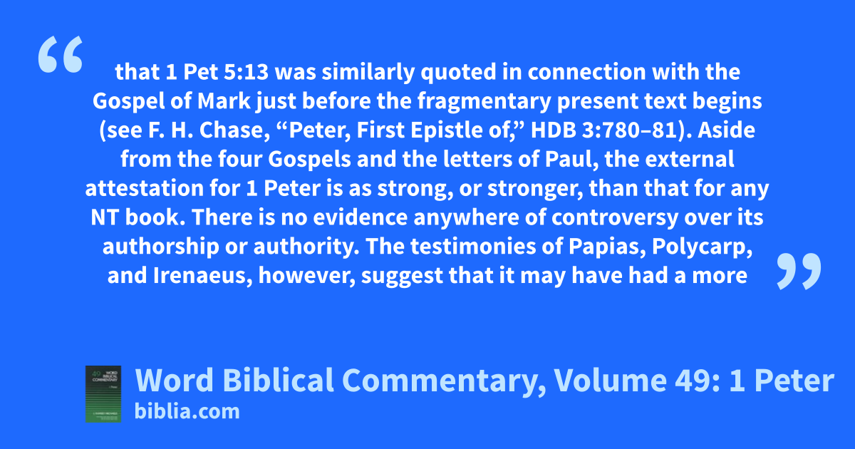that 1 Pet 5:13 was similarly quoted in connection with the Gospel of Mark just before the fragmentary present text begins (see F. H. Chase, “Peter, First Epistle of,” HDB 3:780–81). Aside from the four Gospels and the letters of Paul, the external attestation for 1 Peter is as strong, or stronger, than that for any NT book. There is no evidence anywhere of controversy over its authorship or authority. The testimonies of Papias, Polycarp, and Irenaeus, however, suggest that it may have had a more