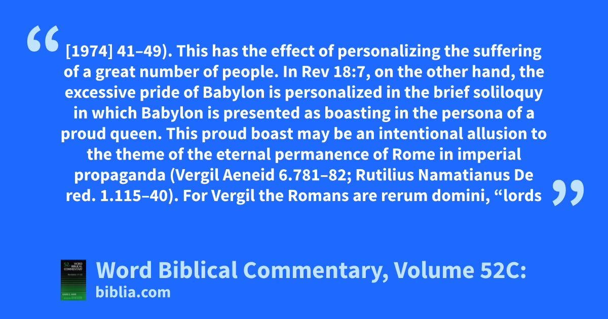 [1974] 41–49). This has the effect of personalizing the suffering of a great number of people. In Rev 18:7, on the other hand, the excessive pride of Babylon is personalized in the brief soliloquy in which Babylon is presented as boasting in the persona of a proud queen. This proud boast may be an intentional allusion to the theme of the eternal permanence of Rome in imperial propaganda (Vergil Aeneid 6.781–82; Rutilius Namatianus De red. 1.115–40). For Vergil the Romans are rerum domini, “lords