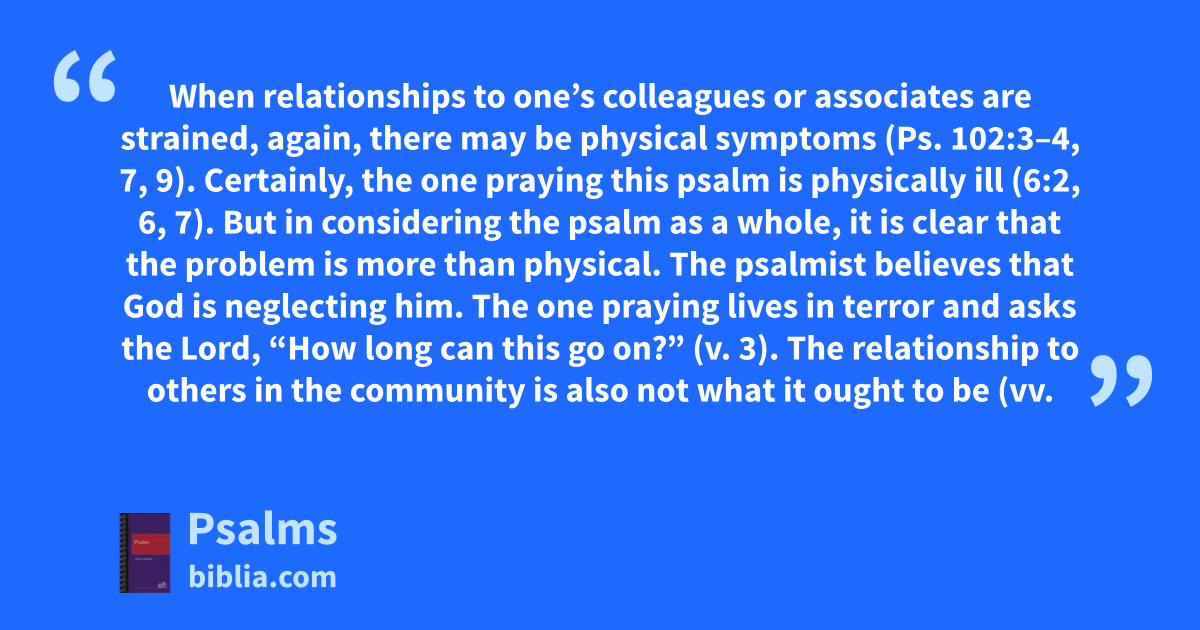 When relationships to one’s colleagues or associates are strained, again, there may be physical symptoms (Ps. 102:3–4, 7, 9). Certainly, the one praying this psalm is physically ill (6:2, 6, 7). But in considering the psalm as a whole, it is clear that the problem is more than physical. The psalmist believes that God is neglecting him. The one praying lives in terror and asks the Lord, “How long can this go on?” (v. 3). The relationship to others in the community is also not what it ought to be (vv.