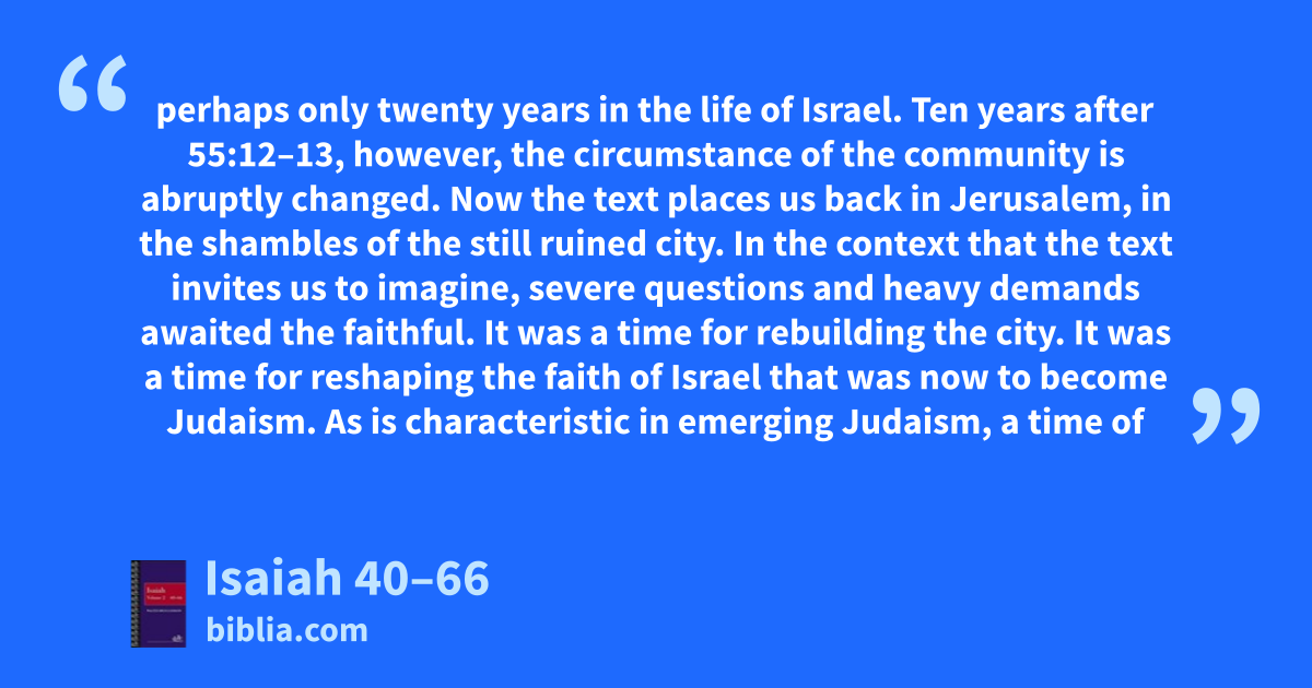 In this volume, Walter Brueggemann focuses on Second Isaiah (Isaiah 40–55), believed to be written by a second exilic poet, and Third Isaiah (Isaiah 56–66), a third group of texts that rearticulate Isaianic theology in yet another faith situation. Brueggemann discusses both the distinctiveness of the texts and their canonical relatedness.