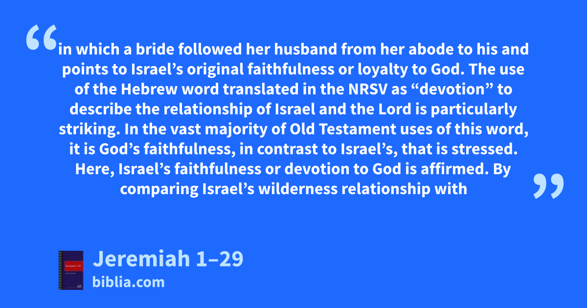 in which a bride followed her husband from her abode to his and points to Israel’s original faithfulness or loyalty to God. The use of the Hebrew word translated in the NRSV as “devotion” to describe the relationship of Israel and the Lord is particularly striking. In the vast majority of Old Testament uses of this word, it is God’s faithfulness, in contrast to Israel’s, that is stressed. Here, Israel’s faithfulness or devotion to God is affirmed. By comparing Israel’s wilderness relationship with