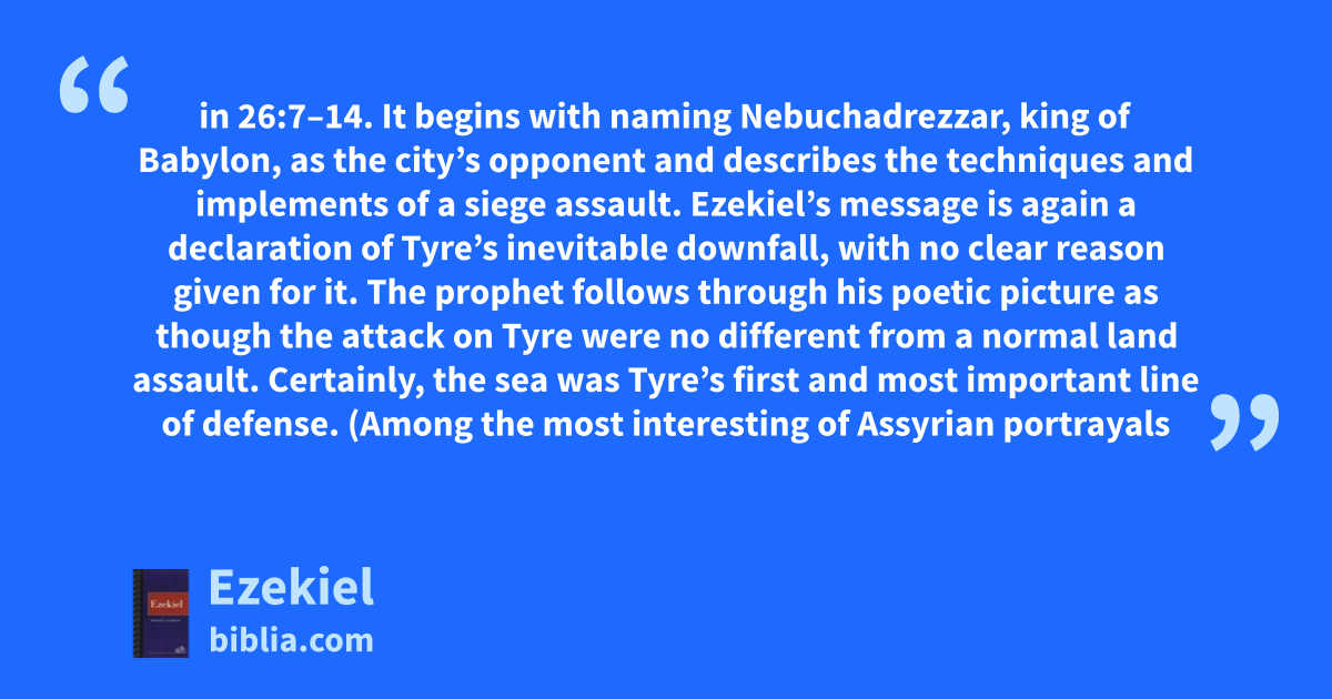 in 26:7–14. It begins with naming Nebuchadrezzar, king of Babylon, as the city’s opponent and describes the techniques and implements of a siege assault. Ezekiel’s message is again a declaration of Tyre’s inevitable downfall, with no clear reason given for it. The prophet follows through his poetic picture as though the attack on Tyre were no different from a normal land assault. Certainly, the sea was Tyre’s first and most important line of defense. (Among the most interesting of Assyrian portrayals