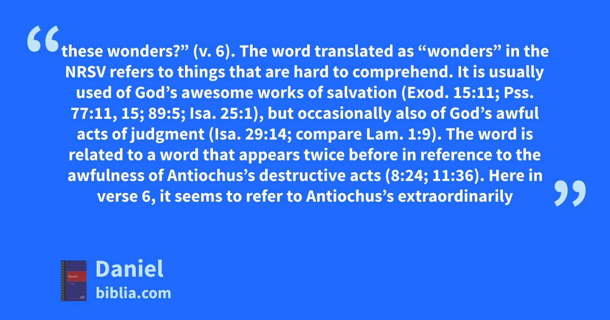 these wonders?” (v. 6). The word translated as “wonders” in the NRSV refers to things that are hard to comprehend. It is usually used of God’s awesome works of salvation (Exod. 15:11; Pss. 77:11, 15; 89:5; Isa. 25:1), but occasionally also of God’s awful acts of judgment (Isa. 29:14; compare Lam. 1:9). The word is related to a word that appears twice before in reference to the awfulness of Antiochus’s destructive acts (8:24; 11:36). Here in verse 6, it seems to refer to Antiochus’s extraordinarily