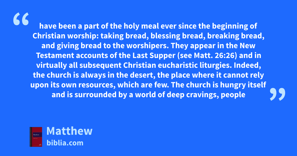 have been a part of the holy meal ever since the beginning of Christian worship: taking bread, blessing bread, breaking bread, and giving bread to the worshipers. They appear in the New Testament accounts of the Last Supper (see Matt. 26:26) and in virtually all subsequent Christian eucharistic liturgies. Indeed, the church is always in the desert, the place where it cannot rely upon its own resources, which are few. The church is hungry itself and is surrounded by a world of deep cravings, people