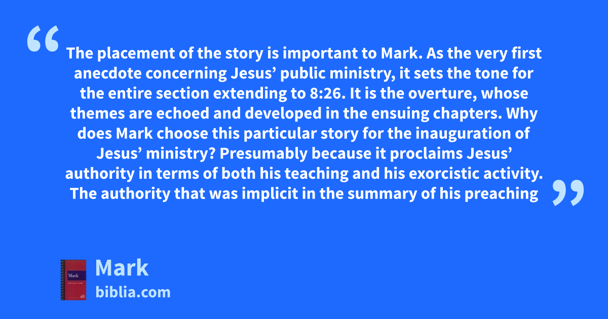 The placement of the story is important to Mark. As the very first anecdote concerning Jesus’ public ministry, it sets the tone for the entire section extending to 8:26. It is the overture, whose themes are echoed and developed in the ensuing chapters. Why does Mark choose this particular story for the inauguration of Jesus’ ministry? Presumably because it proclaims Jesus’ authority in terms of both his teaching and his exorcistic activity. The authority that was implicit in the summary of his preaching
