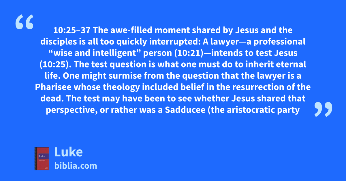 10:25–37 The awe-filled moment shared by Jesus and the disciples is all too quickly interrupted: A lawyer—a professional “wise and intelligent” person (10:21)—intends to test Jesus (10:25). The test question is what one must do to inherit eternal life. One might surmise from the question that the lawyer is a Pharisee whose theology included belief in the resurrection of the dead. The test may have been to see whether Jesus shared that perspective, or rather was a Sadducee (the aristocratic party