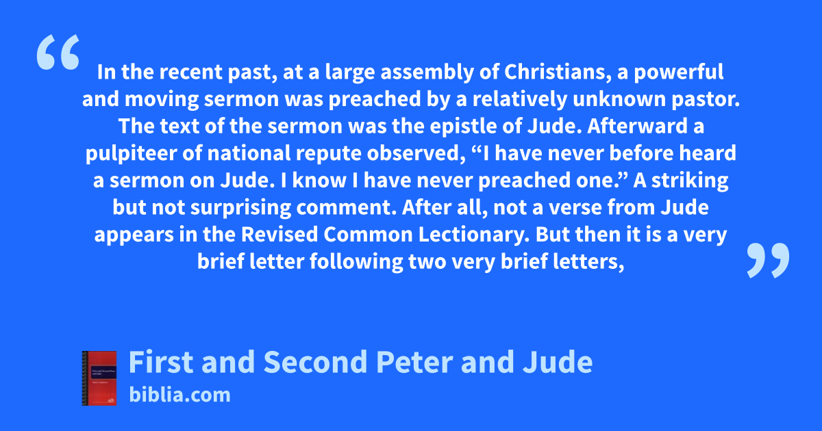 In the recent past, at a large assembly of Christians, a powerful and moving sermon was preached by a relatively unknown pastor. The text of the sermon was the epistle of Jude. Afterward a pulpiteer of national repute observed, “I have never before heard a sermon on Jude. I know I have never preached one.” A striking but not surprising comment. After all, not a verse from Jude appears in the Revised Common Lectionary. But then it is a very brief letter following two very brief letters,