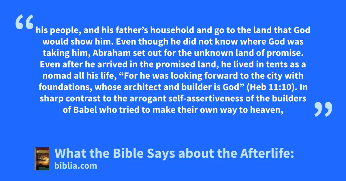 his people, and his father’s household and go to the land that God would show him. Even though he did not know where God was taking him, Abraham set out for the unknown land of promise. Even after he arrived in the promised land, he lived in tents as a nomad all his life, “For he was looking forward to the city with foundations, whose architect and builder is God” (Heb 11:10). In sharp contrast to the arrogant self-assertiveness of the builders of Babel who tried to make their own way to heaven,
