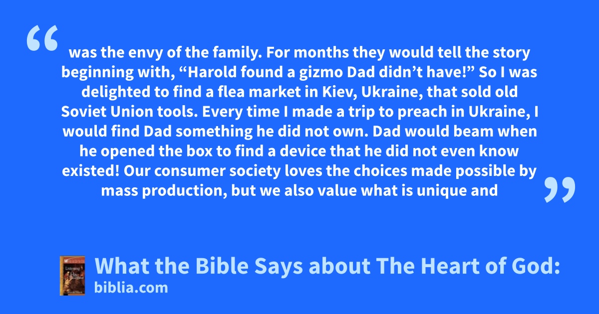 was the envy of the family. For months they would tell the story beginning with, “Harold found a gizmo Dad didn’t have!” So I was delighted to find a flea market in Kiev, Ukraine, that sold old Soviet Union tools. Every time I made a trip to preach in Ukraine, I would find Dad something he did not own. Dad would beam when he opened the box to find a device that he did not even know existed! Our consumer society loves the choices made possible by mass production, but we also value what is unique and