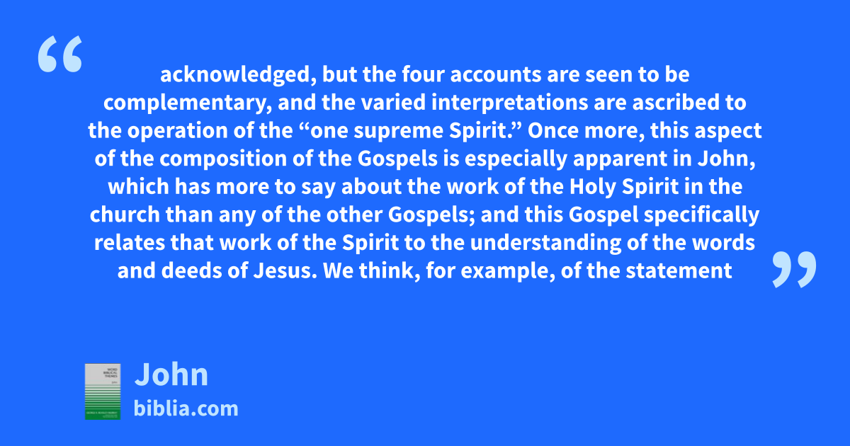 acknowledged, but the four accounts are seen to be complementary, and the varied interpretations are ascribed to the operation of the “one supreme Spirit.” Once more, this aspect of the composition of the Gospels is especially apparent in John, which has more to say about the work of the Holy Spirit in the church than any of the other Gospels; and this Gospel specifically relates that work of the Spirit to the understanding of the words and deeds of Jesus. We think, for example, of the statement