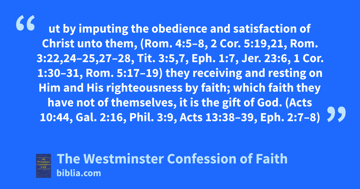 ut by imputing the obedience and satisfaction of Christ unto them, (Rom. 4:5–8, 2 Cor. 5:19,21, Rom. 3:22,24–25,27–28, Tit. 3:5,7, Eph. 1:7, Jer. 23:6, 1 Cor. 1:30–31, Rom. 5:17–19) they receiving and resting on Him and His righteousness by faith; which faith they have not of themselves, it is the gift of God. (Acts 10:44, Gal. 2:16, Phil. 3:9, Acts 13:38–39, Eph. 2:7–8)