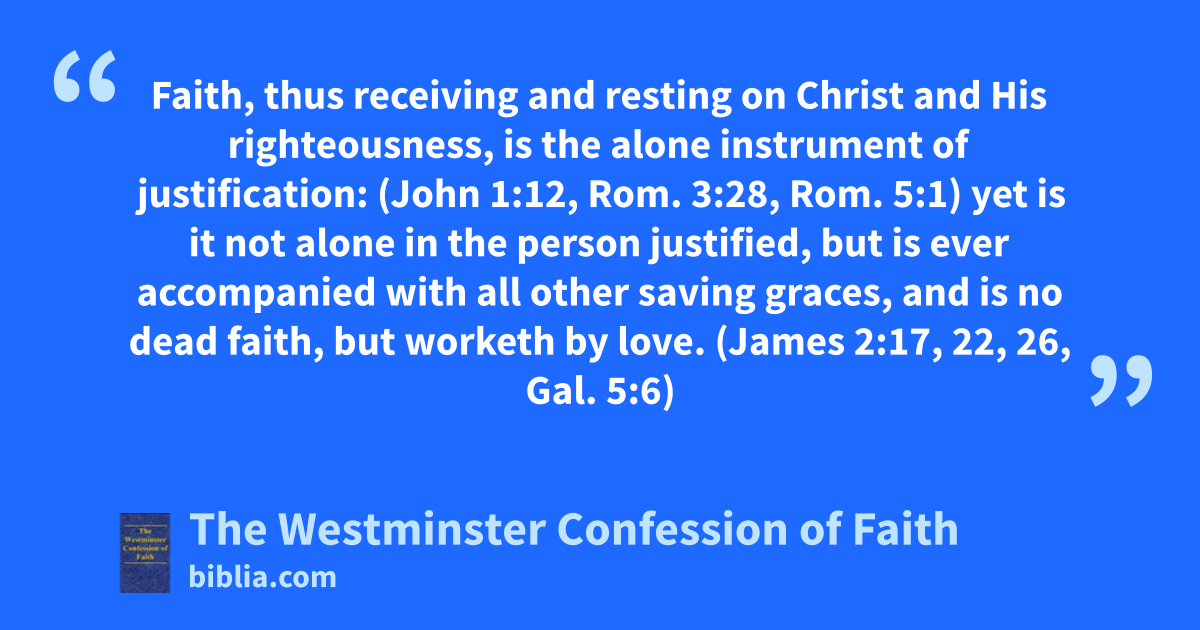Faith, thus receiving and resting on Christ and His righteousness, is the alone instrument of justification: (John 1:12, Rom. 3:28, Rom. 5:1) yet is it not alone in the person justified, but is ever accompanied with all other saving graces, and is no dead faith, but worketh by love. (James 2:17, 22, 26, Gal. 5:6)