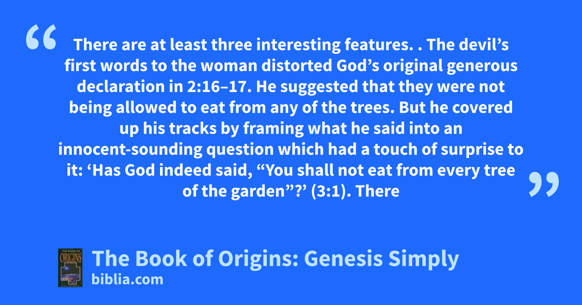 There are at least three interesting features. . The devil’s first words to the woman distorted God’s original generous declaration in 2:16–17. He suggested that they were not being allowed to eat from any of the trees. But he covered up his tracks by framing what he said into an innocent-sounding question which had a touch of surprise to it: ‘Has God indeed said, “You shall not eat from every tree of the garden”?’ (3:1). There