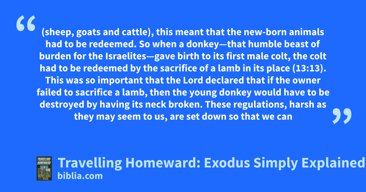 (sheep, goats and cattle), this meant that the new-born animals had to be redeemed. So when a donkey—that humble beast of burden for the Israelites—gave birth to its first male colt, the colt had to be redeemed by the sacrifice of a lamb in its place (13:13). This was so important that the Lord declared that if the owner failed to sacrifice a lamb, then the young donkey would have to be destroyed by having its neck broken. These regulations, harsh as they may seem to us, are set down so that we can