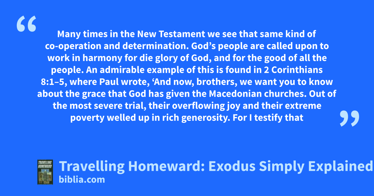 Many times in the New Testament we see that same kind of co-operation and determination. God’s people are called upon to work in harmony for die glory of God, and for the good of all the people. An admirable example of this is found in 2 Corinthians 8:1–5, where Paul wrote, ‘And now, brothers, we want you to know about the grace that God has given the Macedonian churches. Out of the most severe trial, their overflowing joy and their extreme poverty welled up in rich generosity. For I testify that