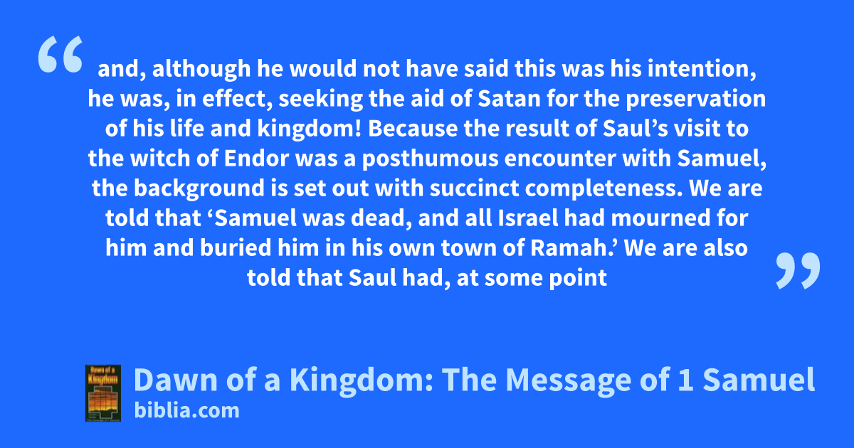 and, although he would not have said this was his intention, he was, in effect, seeking the aid of Satan for the preservation of his life and kingdom! Because the result of Saul’s visit to the witch of Endor was a posthumous encounter with Samuel, the background is set out with succinct completeness. We are told that ‘Samuel was dead, and all Israel had mourned for him and buried him in his own town of Ramah.’ We are also told that Saul had, at some point