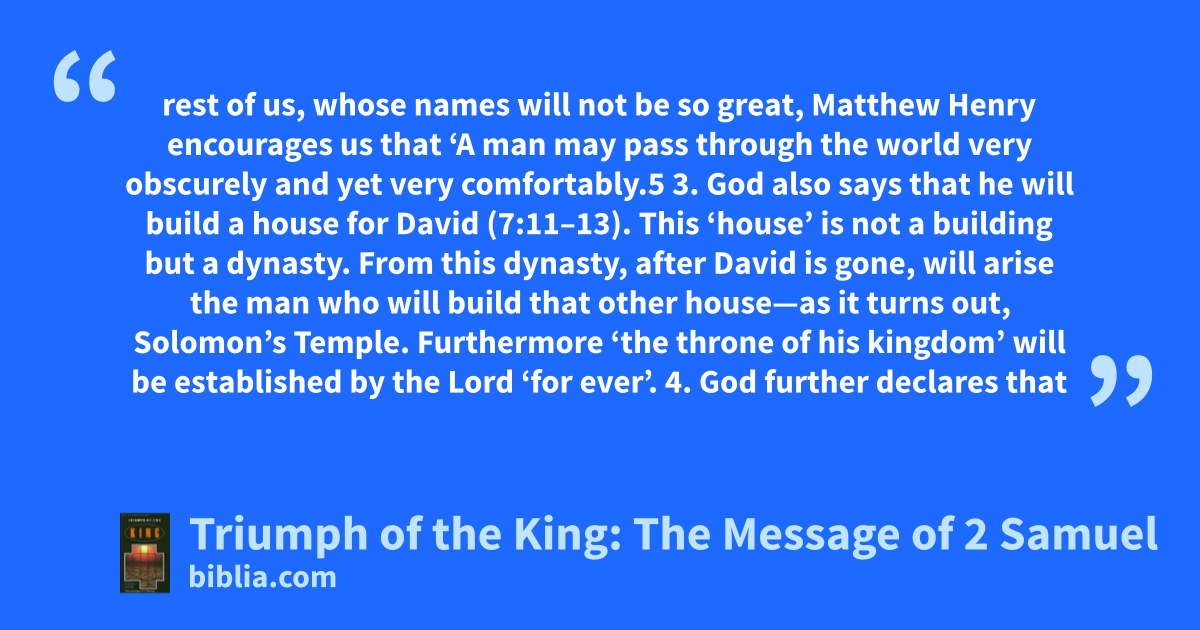 rest of us, whose names will not be so great, Matthew Henry encourages us that ‘A man may pass through the world very obscurely and yet very comfortably.5 3. God also says that he will build a house for David (7:11–13). This ‘house’ is not a building but a dynasty. From this dynasty, after David is gone, will arise the man who will build that other house—as it turns out, Solomon’s Temple. Furthermore ‘the throne of his kingdom’ will be established by the Lord ‘for ever’. 4. God further declares that