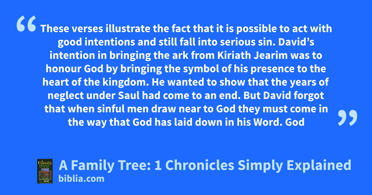These verses illustrate the fact that it is possible to act with good intentions and still fall into serious sin. David’s intention in bringing the ark from Kiriath Jearim was to honour God by bringing the symbol of his presence to the heart of the kingdom. He wanted to show that the years of neglect under Saul had come to an end. But David forgot that when sinful men draw near to God they must come in the way that God has laid down in his Word. God