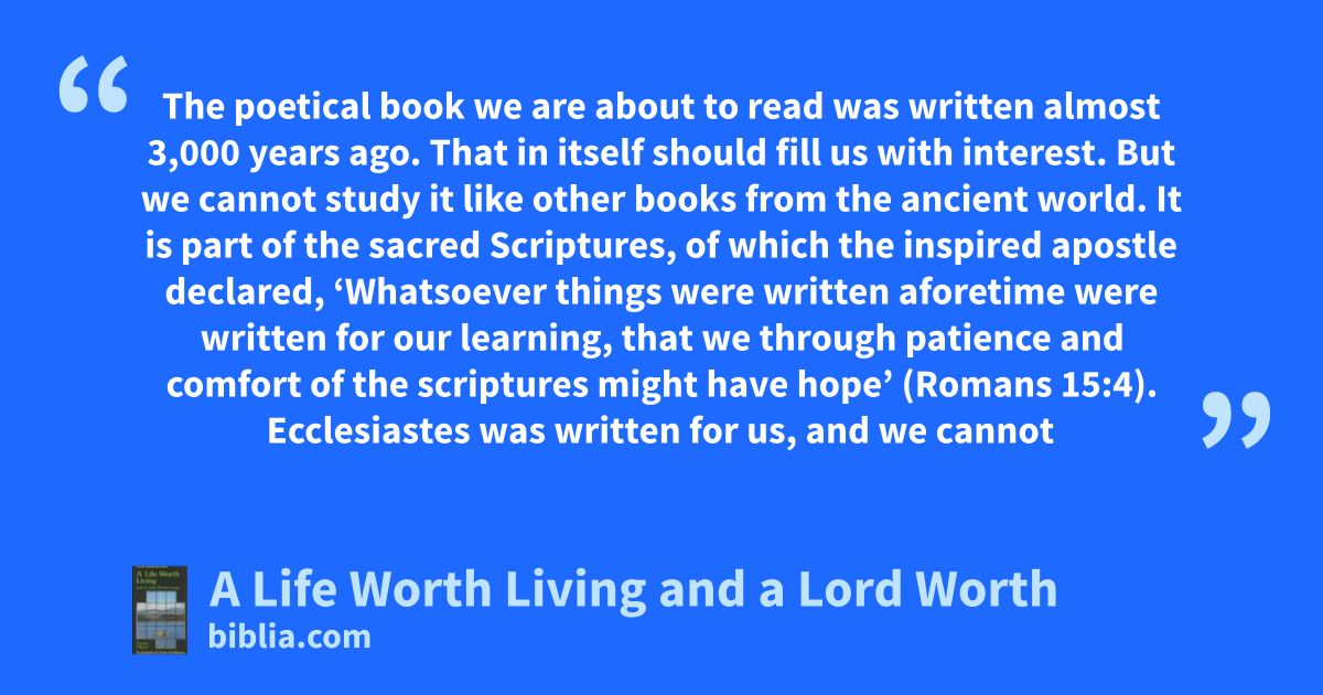The poetical book we are about to read was written almost 3,000 years ago. That in itself should fill us with interest. But we cannot study it like other books from the ancient world. It is part of the sacred Scriptures, of which the inspired apostle declared, ‘Whatsoever things were written aforetime were written for our learning, that we through patience and comfort of the scriptures might have hope’ (Romans 15:4). Ecclesiastes was written for us, and we cannot