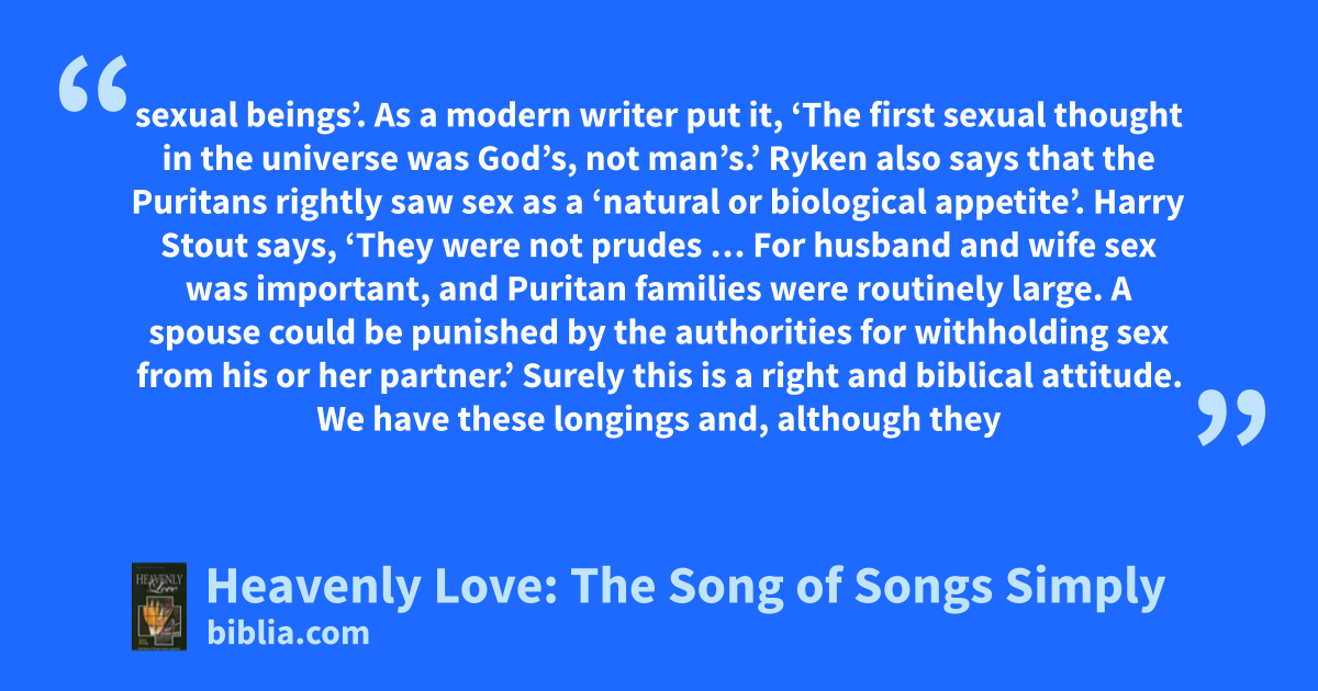 sexual beings’. As a modern writer put it, ‘The first sexual thought in the universe was God’s, not man’s.’ Ryken also says that the Puritans rightly saw sex as a ‘natural or biological appetite’. Harry Stout says, ‘They were not prudes … For husband and wife sex was important, and Puritan families were routinely large. A spouse could be punished by the authorities for withholding sex from his or her partner.’ Surely this is a right and biblical attitude. We have these longings and, although they