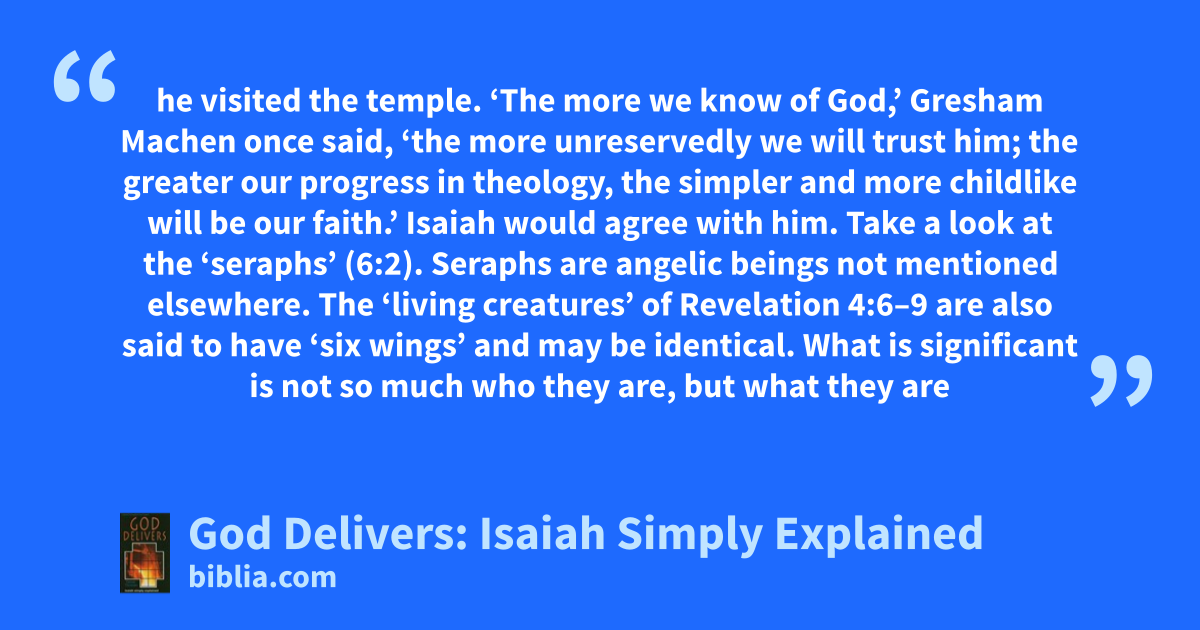 he visited the temple. ‘The more we know of God,’ Gresham Machen once said, ‘the more unreservedly we will trust him; the greater our progress in theology, the simpler and more childlike will be our faith.’ Isaiah would agree with him. Take a look at the ‘seraphs’ (6:2). Seraphs are angelic beings not mentioned elsewhere. The ‘living creatures’ of Revelation 4:6–9 are also said to have ‘six wings’ and may be identical. What is significant is not so much who they are, but what they are