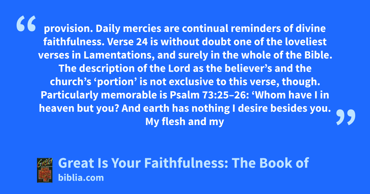 provision. Daily mercies are continual reminders of divine faithfulness. Verse 24 is without doubt one of the loveliest verses in Lamentations, and surely in the whole of the Bible. The description of the Lord as the believer’s and the church’s ‘portion’ is not exclusive to this verse, though. Particularly memorable is Psalm 73:25–26: ‘Whom have I in heaven but you? And earth has nothing I desire besides you. My flesh and my