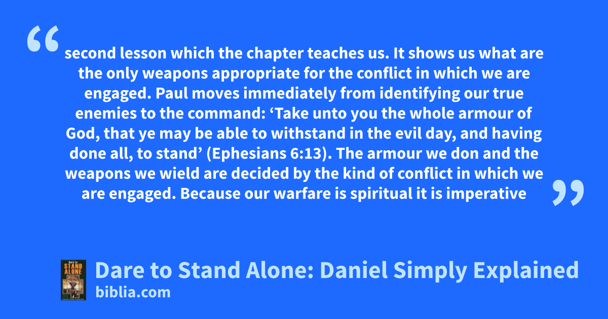 second lesson which the chapter teaches us. It shows us what are the only weapons appropriate for the conflict in which we are engaged. Paul moves immediately from identifying our true enemies to the command: ‘Take unto you the whole armour of God, that ye may be able to withstand in the evil day, and having done all, to stand’ (Ephesians 6:13). The armour we don and the weapons we wield are decided by the kind of conflict in which we are engaged. Because our warfare is spiritual it is imperative