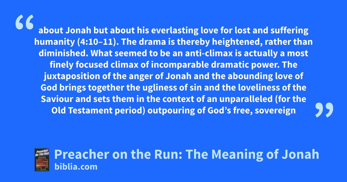 about Jonah but about his everlasting love for lost and suffering humanity (4:10–11). The drama is thereby heightened, rather than diminished. What seemed to be an anti-climax is actually a most finely focused climax of incomparable dramatic power. The juxtaposition of the anger of Jonah and the abounding love of God brings together the ugliness of sin and the loveliness of the Saviour and sets them in the context of an unparalleled (for the Old Testament period) outpouring of God’s free, sovereign