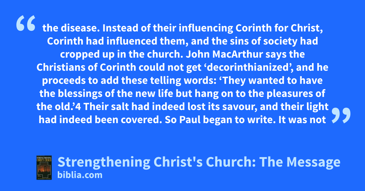 the disease. Instead of their influencing Corinth for Christ, Corinth had influenced them, and the sins of society had cropped up in the church. John MacArthur says the Christians of Corinth could not get ‘decorinthianized’, and he proceeds to add these telling words: ‘They wanted to have the blessings of the new life but hang on to the pleasures of the old.’4 Their salt had indeed lost its savour, and their light had indeed been covered. So Paul began to write. It was not