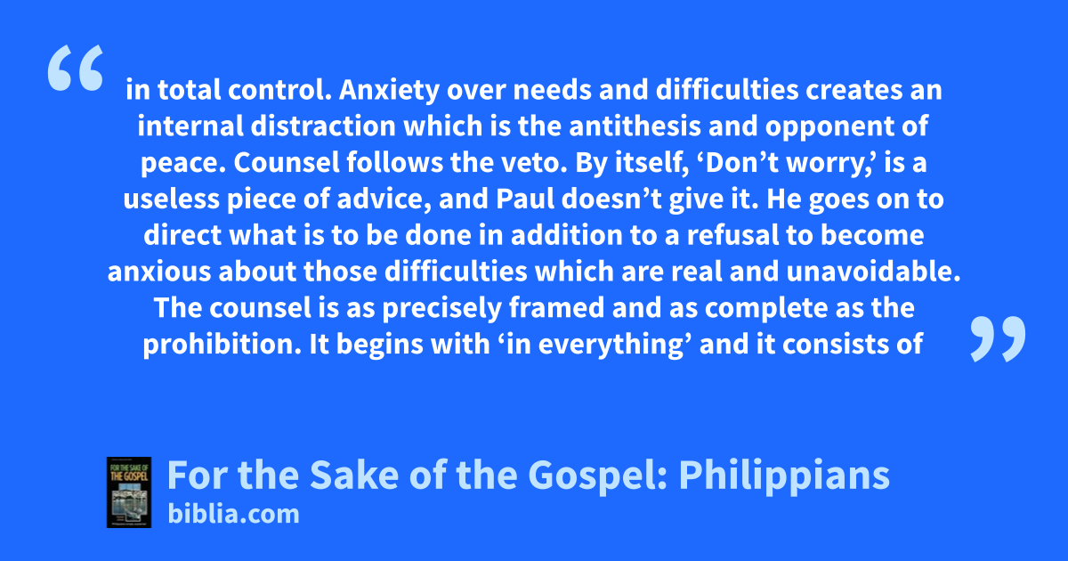 in total control. Anxiety over needs and difficulties creates an internal distraction which is the antithesis and opponent of peace. Counsel follows the veto. By itself, ‘Don’t worry,’ is a useless piece of advice, and Paul doesn’t give it. He goes on to direct what is to be done in addition to a refusal to become anxious about those difficulties which are real and unavoidable. The counsel is as precisely framed and as complete as the prohibition. It begins with ‘in everything’ and it consists of